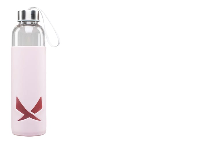 Vattenflaska i tåligt borosilikatglas och med skyddande överdrag i silikon. Flaskan är fri från PVC, BPA och ftalater. Vattenflaskan inklusive silikonöverdrag tål maskindisk. Korken tål inte maskindisk utan måste diskas för hand. Pris: 149:-